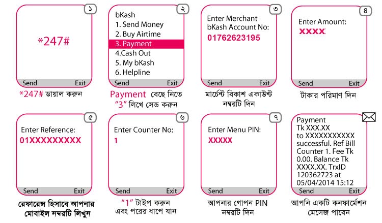 You can make payment using your bKash wallet to our Merchant Account ( 01762623195 ) as below.